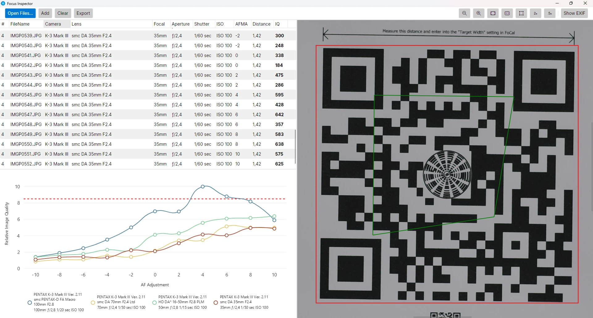 Load Images: Upload the captured images into the calibration tool. The tool will automatically extract useful EXIF data such as camera model, focal length, aperture, and manufacturer metadata like lens type, focus distance, and AF Micro-Adjustment settings.