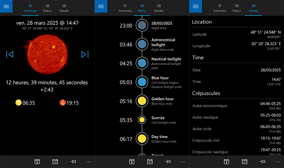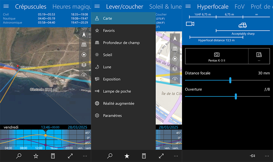 I developed a comprehensive set of features for my app. One feature I particularly liked, not found in PhotoPills, is the ability to open a photo and have the app automatically configure the exact location, angle of view, focal length, aperture, date, and other settings to retrieve the capture conditions.